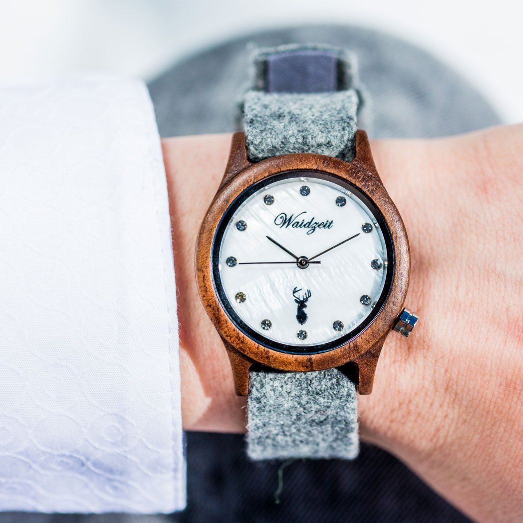 Dámske hodinky Matterhorn sú vyrobené z dreva (orech) a disponujú perleťovým ciferníkom z hlbín mora ozdobeným jagavými krištáľmi.