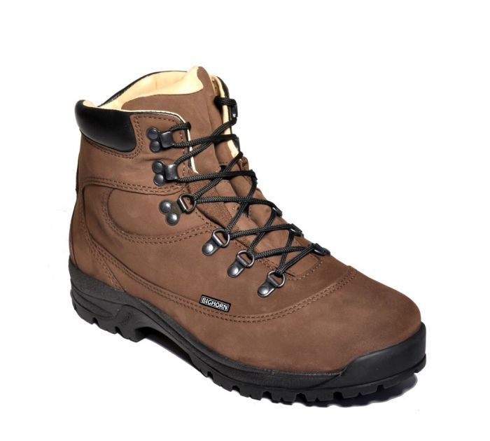 Pánska treková obuv bighorn ALASKA je vhodná na celoročné užívanie do náročných podmienok. Farba obuvi je hnedá. Odporúčané používanie pre horskú turistiku, outdoor, poľovníctvo a poľovníctvo. Zvršok je vyrobený zo silnej vodeodolnej nubukovej usne. Podšívka a vložka je z hladkej kože . Podrážka VIBRAM z kvalitnej gumy je pružná a veľmi priľnavá. Topánky majú systém rýchleho šnurovania s dvoma háčikmi na vrchu a stabilizátor pary.
