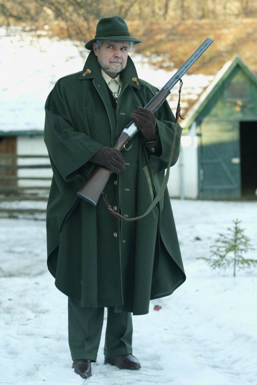 Dlhá pelerína, vode odolný teflon zo základného lodenového materiálu, zdobený lemovkou z umelého velúru, gombíky z parožia.