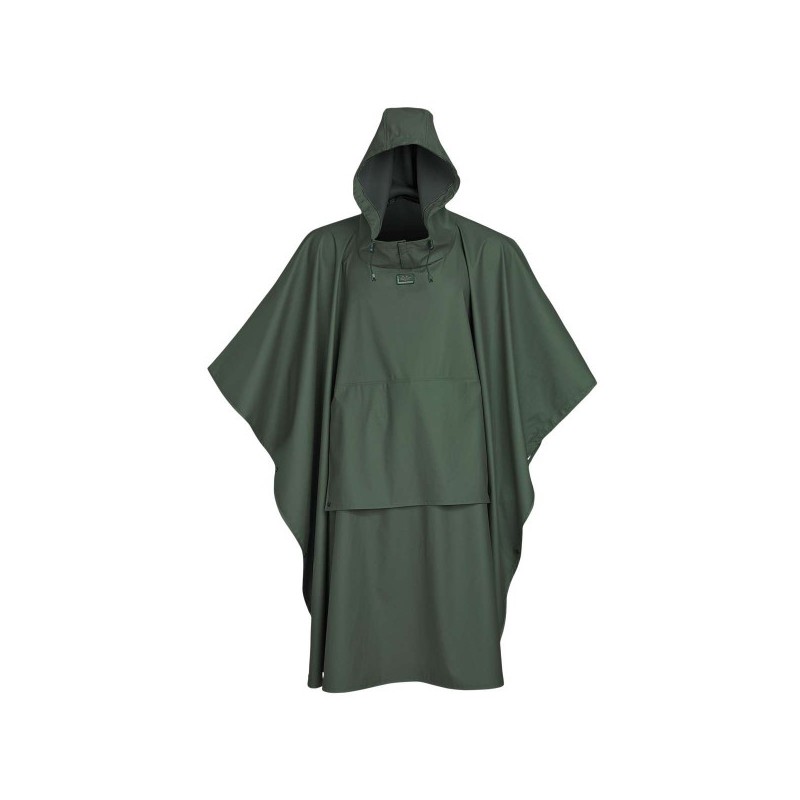 Pončo s teplým fleecovým rukávníkom a stiahnuteľnou kapucňou je vyrobené z pružného a vodeodolného PU. Na prednej časti je prekrytie pre čiastočnú ochranu zbrane proti dažďu.
