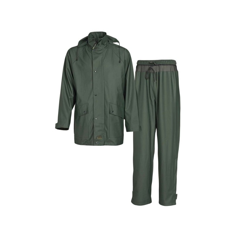 Set do dažďa tvorí plášť s prekrytým celozapínacím zipsom a pohodlné nohavice s pružným pásom a sťahovacími páskami okolo topánok. Vyrobený z pružného a vodeodolného PU.