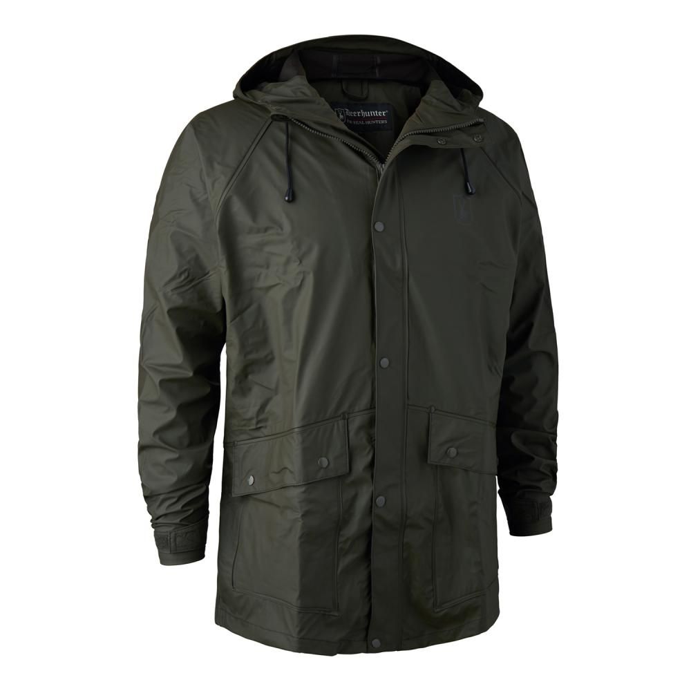 Bunda do dažďa Deerhunter s kapucňou a vetraním vzadu - 100% vodeodolná. Bunda s kapucňou v jednofarebnej zelenej farbe s PU poťahom. Predné vrecká s gombíkmi a vetraním vzadu. Možno prať v práčke.