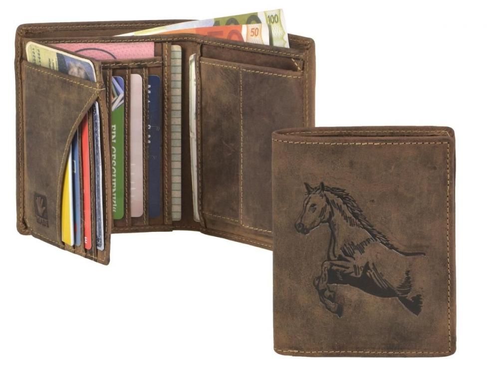 Pánska peňaženka z kvalitnej brúsenej kože Greenburry 9,5x12cm s razbou koňa. Ručná výroba. Farba hnedá.