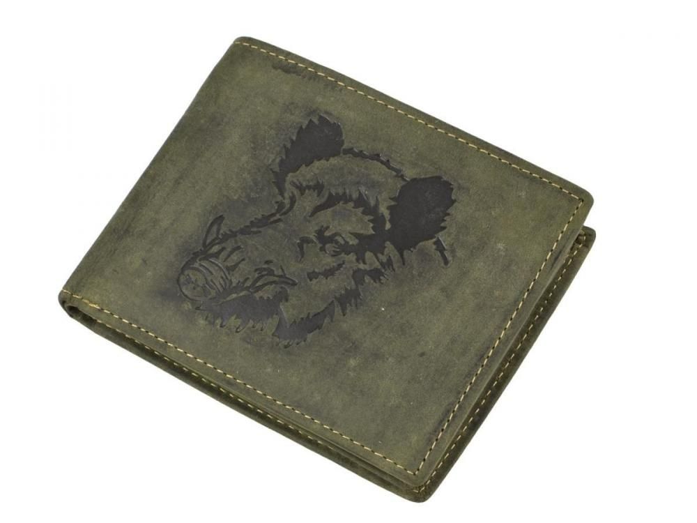 Pánska peňaženka z kvalitnej brúsenej kože Greenburry 12,5x10cm s razbou diviaka. Ručná výroba. Farba zelená.
