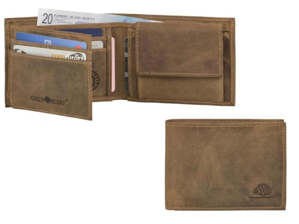 Kožená peňaženka Greenburry menšieho rozmeru približne 11,5 x 8,5 x 2,0 cm.