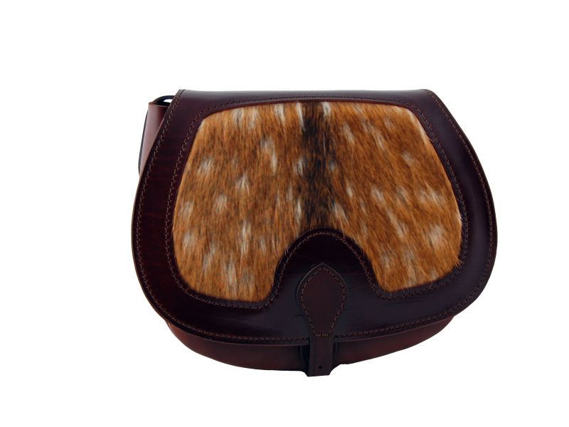 Kvalitná pevná odolná malá kožená lovecká brašňa z hovädziny s danieliou srsťou.