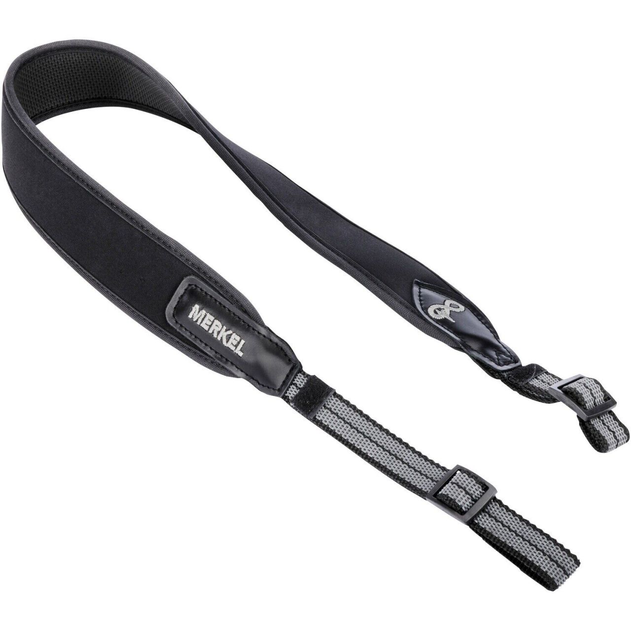 Neoprénový remeň od firmy Merkel GEAR je pohodlný, kvalitne spracovaný a vďaka určitej elasticite veľmi príjemný na dotyk. Mäkká neoprénová časť so šírkou približne 5 cm poskytuje dostatočnú opornú plochu pre ťažké zbrane. Na rozdiel od iných popruhov je neoprénová časť dlhá asi 70 cm, takže rameno môže mať stále úžitok zo širokej opornej plochy. Štruktúrovaná gumová spodná plocha pásu zaisťuje účinné protišmykové ovládanie a remeň, tak slúži ako vankúšik na streľbu. Jemné logo Merkel Gear na lemoch z pravej kože. Celková dĺžka okolo 115 cm.