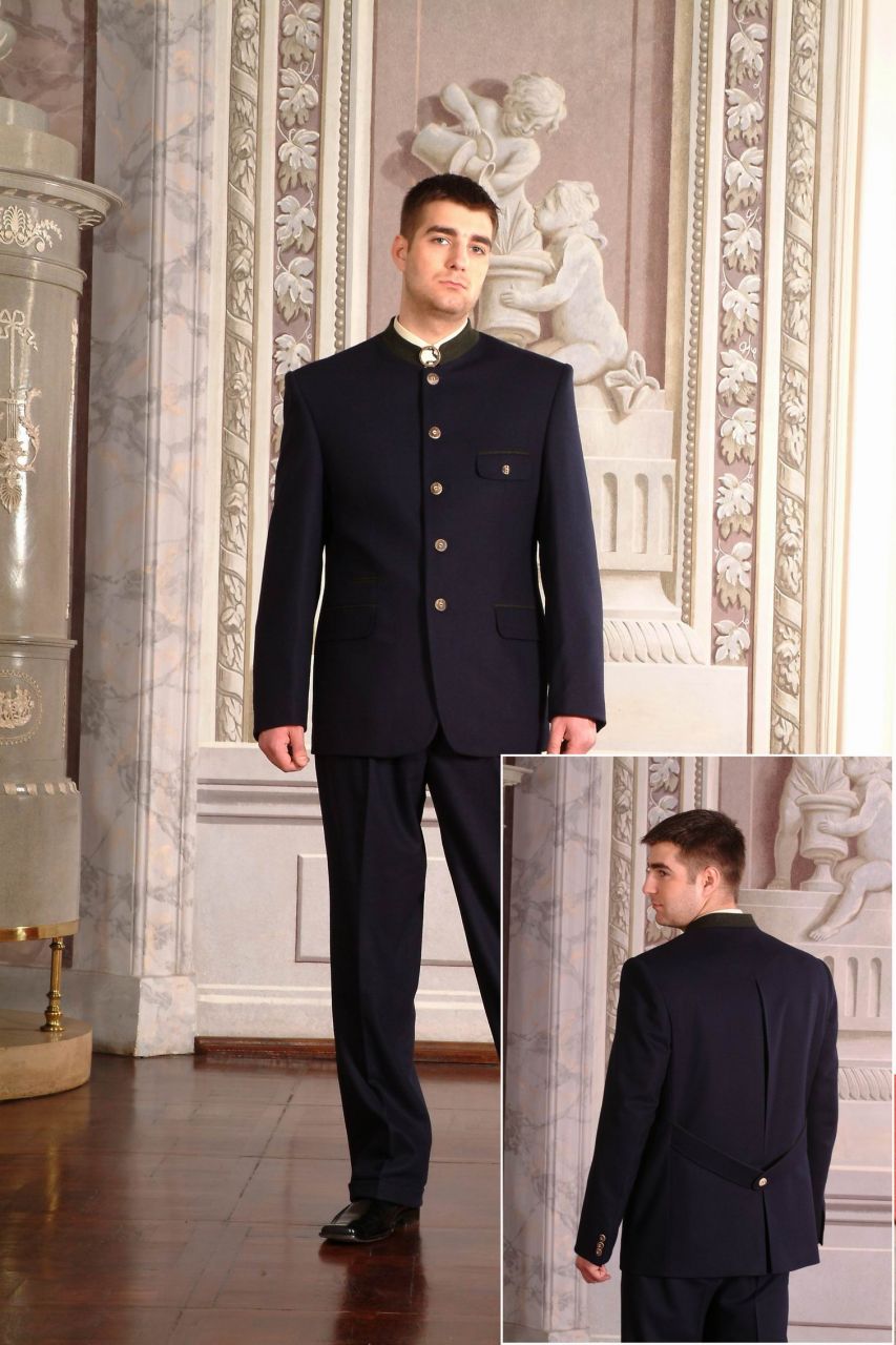 Tmavomodrý oblek so stojatým golierom, golier a lemovky zdobené zeleným vlneným materiálom, gombíky z parožia.