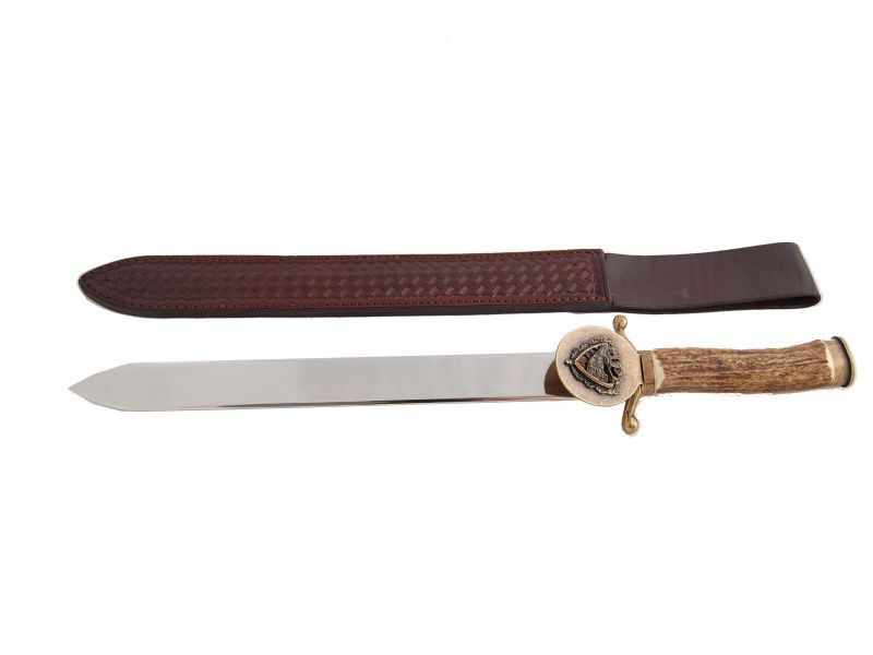 Poľovnícky pasovací tesák jeleň: nerezová čepel, parohová rukoväť, na záštite motívy zveri.
