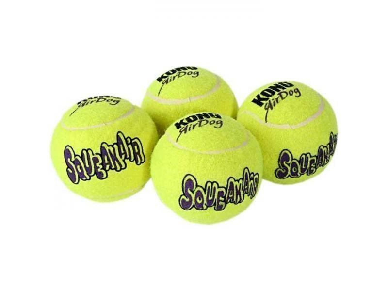 KONG AirDog tenisová loptička kombinuje dve obľúbené psie hračky - tenisovú loptičku a pískacie hračky - tým vytvára perfektnú hračku na chytanie. Pískacia loptička je ideálna k hre alebo aportu. Váš pes bude vedieť, že sa blíži čas hry, akonáhle zapískajú. Odolná a kvalitná loptička nepoškodí psie zuby. Je vyrobený zo špeciálnej neabrazívny plsti, v porovnaní s brúsnym materiálom u bežných tenisových loptičiek.