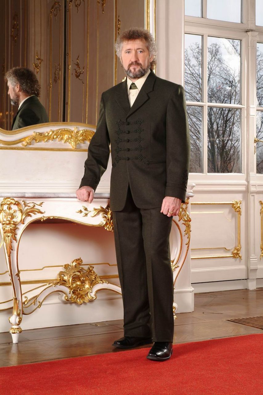 Tradičný maďarský jednoradový, trojgombíkový lodenový oblek, zdobený umeleckým lemom s motívom žaluďov. Výnimočné vypracovanie vrecka.