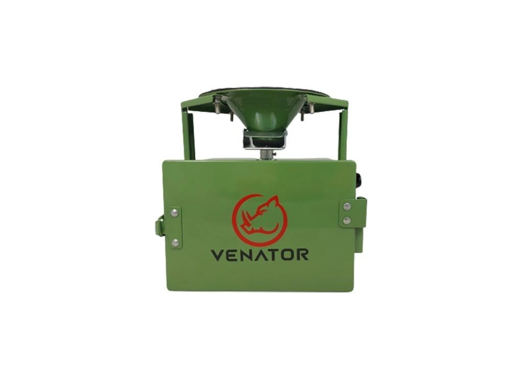 Kovový kŕmny automat Feed22S značky Venator s nastaviteľným časovaním a prídavným solárnym panelom. Konštruovaný na rozmetanie krmiva v 360 °.
